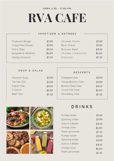 Stop by RVA Cafe for a hot cup of coffee and a sandwich. This is where your friends are. It's about the vibe, the atmosphere, and of course our friendly staff. Nestled in the heart of beautiful Richmond, VA - it's our little gem. You'll be happy you found us. ca·fe A small restaurant selling light meals and drinks. As Richmond grows, so does its potential for business. Whether it be a restaurant, a coffee shop, or a quaint little cafe, it's nice to know that there's still a quality place to land. Such a short, memorable, easy-to-remember domain name such as 'RVA Cafe' is invaluable when it comes to your marketing campaign. Add to that the rhyming of the domain and well, there couldn't be a more suitable place to launch your new RVA restaurant venture. Realtors say "location, location, location!" for a reason and the same is true for your online, restaurant real estate. Forget RVACafeSpot.com or RVACafeDining.com. Nobody will remember those. The one they'll remember is RVACafe.com. See our mock menu below. The possibilities are endless! ==============